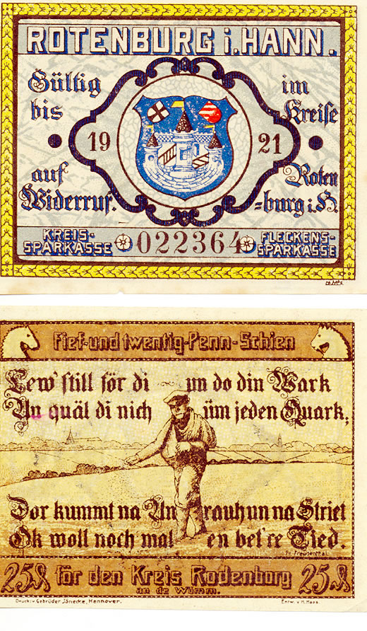 06.03.2010 WAR "WER WEIß DAS?" DOCH ZU SCHWER?Rotenburger Zehner für zwei Ratefüchse War die Frage des Vereins für Touristik und Stadtwerbung (VTS) am Ende doch zu schwer? Ganz einfach sollte es den Lesern des Rotenburger Journals ja aber auch nicht gemacht werden. Bis zum Einsendeschluss gingen dann aber doch noch zwei richtige Lösungen ein. Also, das kleine Gedicht "Lew´still för di" stammt von Friedrich Freudenthal und gedruckt wurde es auf einem "Fief-und twentig-Penn-Schien för den Kreis Rodenborg". Dabei handelt es sich um einen sogenannten Notgeldschein aus dem Jahre 1921 mit einer Gültigkeit "bis auf Widerruf". Heinz G. Gehnke vom InfoBüro der Stadt Rotenburg, der einige dieser Scheine besitzt, war doch recht erstaunt, dass nicht mehr richtige Lösungen eingingen. Selbst "de Vörsitter" der Freudenthal-Gesellschaft aus dem benachbarten Soltau musste passen. Er schrieb "Die Verse sind mir noch nicht begegnet. Ich gebe Ihr Schreiben an das Institut für niederdeutsche Sprache in Bremen weiter!" Gehnke hat Dr. Heinrich Kröger zwischenzeitlich mit einem Schein versorgt , Post aus Bremen ist aber noch nicht eingetroffen. Zwei Journal-Leser haben die richtige Lösung gewusst, auf Postkarten geschrieben und an das InfoBüro gesandt. Als Belohnung erhalten nun Walter Schnackenberg aus Rotenburg und Heinz Hüttmann aus Westerwalsede je einen Rotenburger Zehner zum Einkaufen in der Kreisstadt. Weiter legt der VTS noch einen Rotenburger Glückstaler mit in die Post. Und weil ja noch ein weiterer Zehner im Jackpott liegt, packt der VTS zwei weitere hinzu und möchte nun wissen: "Welche Jahreszahl wurde auf gültige Münzen für den Kreis Rotenburg geprägt?" Wer die Antwort weiß, hat schon so gut wie einen von drei Rotenburger Zehner gewonnen. Einsendeschluß ist Montag, der 12. April 2010 um 12 Uhr. Der Rechtsweg ist ausgeschlossen. Die Anschrift: VTS-Rätsel, Große Straße 1, 27356 Rotenburg (Wümme) oder per E-Mail auf www.vts-row.de oder hier.