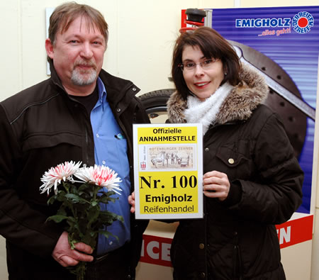 23.01.2009 ZEHNER AUCH FÜR NEUE "PUSCHEN"Reifentreff ist Nummer 100 Es ging doch schneller, als es sich die Leute vom InfoBüro der Stadt Rotenburg vorgestellt hatten. Es gibt nun tatsächlich schon 100 Annahmestellen für den Rotenburger Zehner. Mit einem kleinen Blumenstrauß wurde Emigholz - der Reifentreff begrüßt und auch sofort in die Verzeichnisse eingetragen. Für Betriebsleiter Bernd Rathje war es keine Frage, sich an der Aktion zu beteiligen und als Nummer 100 aufgenommen zu werden sei ja auch was besonderes. Heinz G. Gehnke und Ilona Haas vom Infobüro sind sicher, dass auch noch weitere Betriebe ihre Bereitschaft, den Gutschein anzunehmen, erklären werden. Und wie zu erfahren war, ist die Grafik für den zweiten Zehner bereits fertiggestellt. Ganz sicher zu Ostern hat die Kreisstadt dann ihren nächsten eigenen Gutschein.