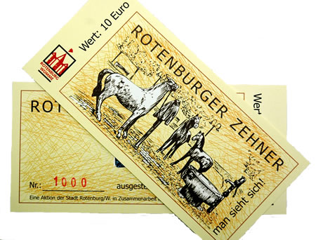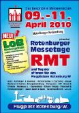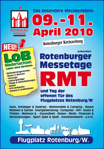 16.02.2010 ZEHNER FÜR DIE ROTENBURGER MESSETAGEDer Rotenburger Zehner wird als Zahlungsmittel für Eintritt und Gastronomie [Haus am Luhner Forst] auf den Rotenburger Messetagen - RMT - akzeptiert, meldet die Rotenburger Kreiszeitung. Die Rotenburger Messetage finden vom 09. bis 11. April 2010 auf dem Flugplatzgelände in Rotenburg statt. Auf den RMT wird eine breite Palette an Produkten und Dienstleistungen regionaler Anbieter präsentiert. Abgerundet wird das Event mit einem bunten Rahmenprogramm für die ganze Familie.