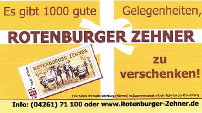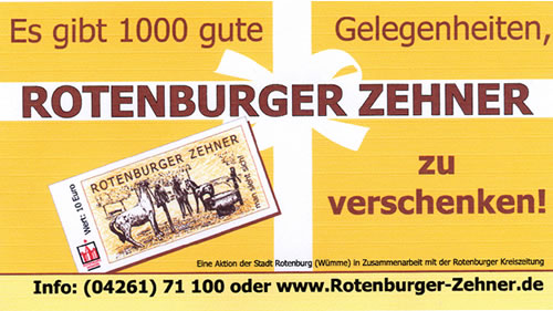 23.09.2009 3000 ZEHNER IN WENIGER ALS 10 MONATENDer Rotenburger Zehner ist in der Rotenburg ein Renner Der Rotenburger Zehner ist in weniger als 10 Monaten fast 3000 Mal verkauft worden. Seit dem 8. Dezember 2008 ist der Gutschein auf den Markt. Zwei verschiedenen Bildmotive (Heimatmuseum und Pferdemarkt) sind durch die Stadt in Umlauf gekommen. Die Stadtwerke haben vor Kurzem eine eigene Auflage gedruckt, um ihren Kunden "Danke!" zu sagen. Allein aus dieser Aktion sind noch einmal fast 12.000 Zehner im Umlauf. Nun sucht der Verein für Touristik und Stadtwerbung (VTS) nach einer Idee für eine dritte Auflage, die voraussichtlich Anfang 2010 gedruckt werden soll. Vorschläge für ein Motiv sind den Mitarbeitern im Informationsbüro (E-Mail: tib@rotenburg-wuemme.de bereits jetzt willkommen. Zu beachten ist allerdings das Querformat des Scheines, der in Rotenburg rund um die Uhr (z.B. bei Shell) zu haben ist. Angenommen wird das Papier in nahezu allen Rotenburger Geschäften.