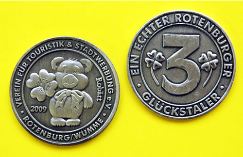 04.02.2009 EIN KLEINES STÜCK VOM GROßEN GLÜCKRotenburg hat jetzt seinen Talisman Wer wünscht es sich nicht ein kleines Stück vom großen Glück und das besonders schon zum Valentinstag? In Rotenburg (Wümme) scheint das jetzt käuflich zu sein. Das zumindest behauptet der soeben neu gegründete „Verein für Touristik und Stadtwerbung“ (VTS). Ab sofort ist in der Kreisstadt der erste echte „Rotenburger Glückstaler“ zu haben. Der Verkauf der grafisch gelungenen Medaille hat begonnen und wie es sich für einen Taler gehört, ist er für nur drei Euro zu bekommen. [mehr...]