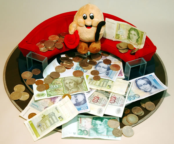 02.03.2010 ROTENBURGER ZEHNER FÜR DEUTSCHE MARKAktion mit Münzen endet am 1. April Nur noch bis zum 31. März 2010 nimmt das InfoBüro der Stadt Rotenburg (Wümme) D-Mark-Münzen als Zahlungsmittel für Rotenburger Zehner an. Ab dem 1. April kann der Gutschein dann nur noch mit Scheinen erworben werden. Bisher sind mehr als 3000 Mark umgesetzt worden und immer noch kommen fast täglich Deutsche Mark auf den Tresen. Nach Meinung von Finanzexperten sind derzeit sicher rund 13,6 Milliarden D-Mark im Umlauf. Täglich bringen bundesweit ca. 1.300 Menschen durchschnittlich 651.000 Mark zurück. Auch in Rotenburg gibt es noch reichlich Mark. Die Annahme von Münzen allerdings ist nicht nur des Gewichtes wegen nicht immer einfach. Daher kann ab dem 1. April ausschließlich noch mit DM-Scheinen bezahlt werden. Ein Rotenburger Zehner ist also für 20 Mark zu haben. Aber auch andere Souvenirs geben die Leute vom InfoBüro gegen Mark raus. Die Umrechung erfolgt ganz einfach im Verhältnis ein Euro = zwei Mark. Für die sogenannten "Schlafmünzen" steht eine kleine Spardose zur Verfügung. Das Geld daraus wird einem Kinderheim im Kenia gespendet. Sonderprägungen von Münzen im Wert von fünf oder zehn Mark können von Sammlern gerne zurückgekauft werden. Näheres dazu gibt es im InfoBüro.