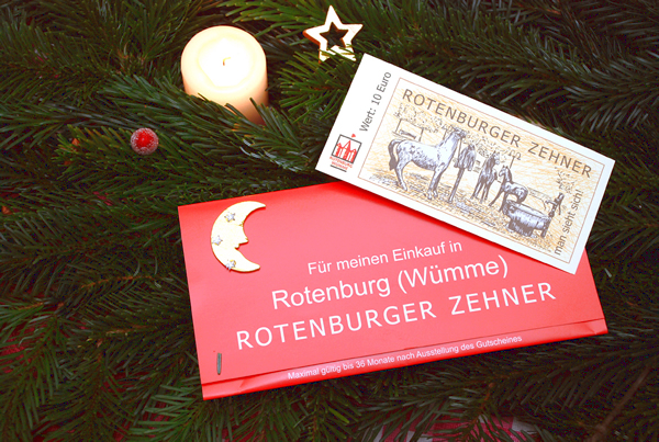 22.11.2010 DEN ZEHNER NR. 3750 GIBT ES GRATISGutschein jetzt im Weihnachtsmäppchen Er ist auch im Jahr 2010 der absolute Verkaufsrenner. Zwischenzeitlich wurde er allein im InfoBüro mehr als 7500 Mal verkauft. Weiterhin dürfte die gleiche Menge aus dem Hause der Stadtwerke Rotenburg mittlerweile im Umlauf sein. Die Rede ist vom Rotenburger Zehner, dem Gutschein, der in fast allen Läden der Stadt nicht erst seit heute gerne angenommen wird. Schon jetzt gibt es den Schein auf Wunsch auch in einem weihnachtlichen Mäppchen. Am 6. Dezember 2008 wurden die ersten Zehner an dankbare Kunden verkauft. Mittlerweile hat die dritte Auflage schon mehr als 3300 Käufer gefunden. Die Idee, die hinter der Aktion stand, ist aus Sicht des Vereins für Touristik und Stadtwerbung (VTS) tadellos realisiert worden. Der Käufer bekommt einen Gutschein, der in über 100 Läden eingelöst werden kann, der Kunde kann ebenso wählen und das Geld bleibt in der Stadt. Auch so kann Wirtschaftsförderung funktionieren. Die Stadtwerke Rotenburg haben sich der Idee angeschlossen und honorieren Kunden-treue eben auch mit Rotenburger Zehnern. Alle Kaufleute bekommen ihr Geld ohne Abzug von der Ausgabestelle zurück. Besser ist eine Kundenbindung nach Meinung des VTS wohl kaum noch zu machen. Der Verkauf der Zehner zur Weihnacht hat derweil begonnen und wer das Glück hat den Zehner mit der Nummer 3750 in die Finger zu bekommen, der darf den Schein ohne zu zahlen gleich mitnehmen. Der VTS drückt allen Gutscheinkäufern ganz feste die Daumen.
