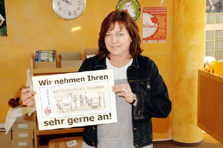 15.10.2010 ZEHNER MIT ZWANZIGER BEZAHLENInfoBüro nimmt auch Deutsche Mark an Wer einen Rotenburger Zehner verschenken möchte und keine Euros in der Tasche hat, muss nicht traurig sein. Das InfoBüro im Rathaus verkauft den Einkaufsgutschein ab sofort auch gegen Deutsche Mark. Viele Bürger verfügen immer noch über Mark und wissen nicht so recht, wohin damit. Das ist nun vorbei. Für jeweils 20 Mark kann ab jetzt ein Zehner gekauft werden. Wer noch etwas Glück dazu möchte, der spart eine ganz Mark, wenn er den Rotenburger Glückstaler erwirbt. Dieser kostet nämlich nur fünf Mark oder drei Euro. Die Idee, auch D-Mark anzunehmen, kam von Verein für Touristik und Stadtwerbung (VTS) und soll den Bürgern helfen, endlich die alte Währung loszuwerden. Es kann also getauscht werden und der VTS sorgt dafür, dass die alten Märker zurück zur Bundesbank kommen. Selbst kleine Beträge nehmen die Info-Leute an und überzählige Pfennige können in eine Sammelbüchse geworfen werden. Der Inhalt wird dann Kindern in Not zukommen. Der Rotenburger Zehner hat sich mittlerweile zu einem unverzichtbaren Geschenkgutschein entwickelt. Viele Bürger nutzen den Service und fast alle Läden in der Kreisstadt nehmen den Schein auch an. Neuen Antrieb bekam die Aktion auch durch die Rotenburger Stadtwerke, die den Schein für Kundentreue mit der Abrechung verteilen. Einen Rotenburger Zehner hat nun auch Schlagerstar Bata Illic, der mit den Leuten aus dem InfoBüro gut befreundet ist. Es wollte aber nicht verraten, wann und wo er den Gutschein einlösen wird.